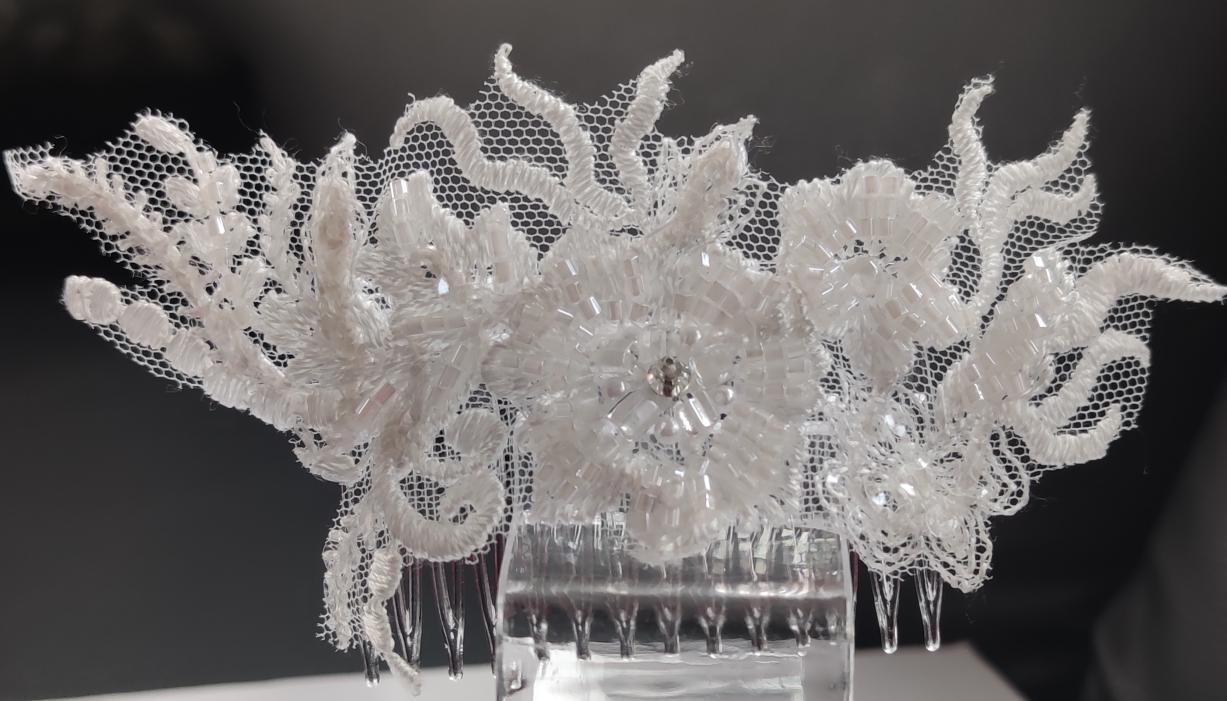 Ozdoba z ivory krajky do vlasů na hřebínku.