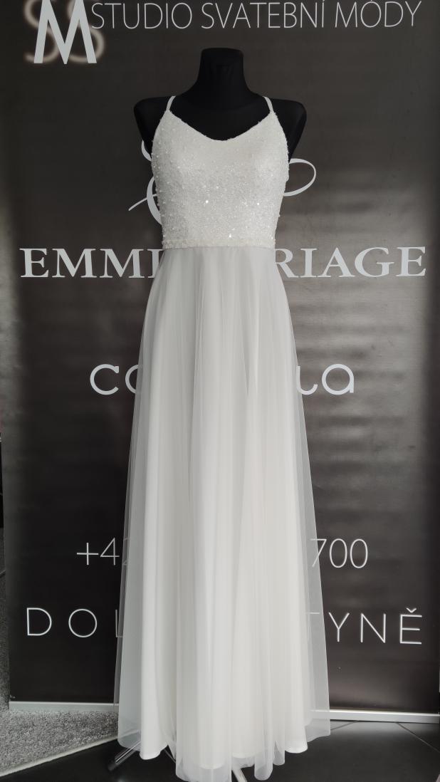 Romantické a třpytivé svatební šaty značky EMMI MARIAGE s tylovou sukní na tenká ramínka. Šaty jsou lehké a pohodlné na zip.