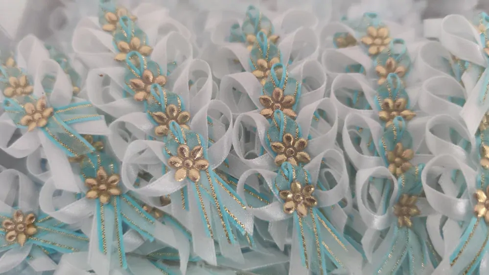 3. Vývazek bílo-tyrkysový + zlatá květinka